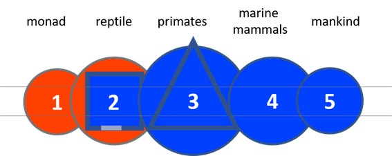 In the beginning (1) there is just affecting force. Then there is activity within a protected space like acting as a reptile (2). You start in an egg, protected by the shell and proceed carrying Your outer protection or stay where it is like in a fortress. You can match this to the idea of a turtle, if You like. Once, You leave the fortress and climb on a hill. The ape on top rules the crowd – silverback (3). Next step is grouping around an issue. Sometimes it is giving birth, sometimes it is hunting. You act like a school of marine mammals (4). You hopefully know this behavior from Your own family. At the end of the evolution, there is everything connected with each other and You are able to see. Because of the ability from tools, mankind (5) is able to enter every sphere in the world directly, instead of being effected in-directly.